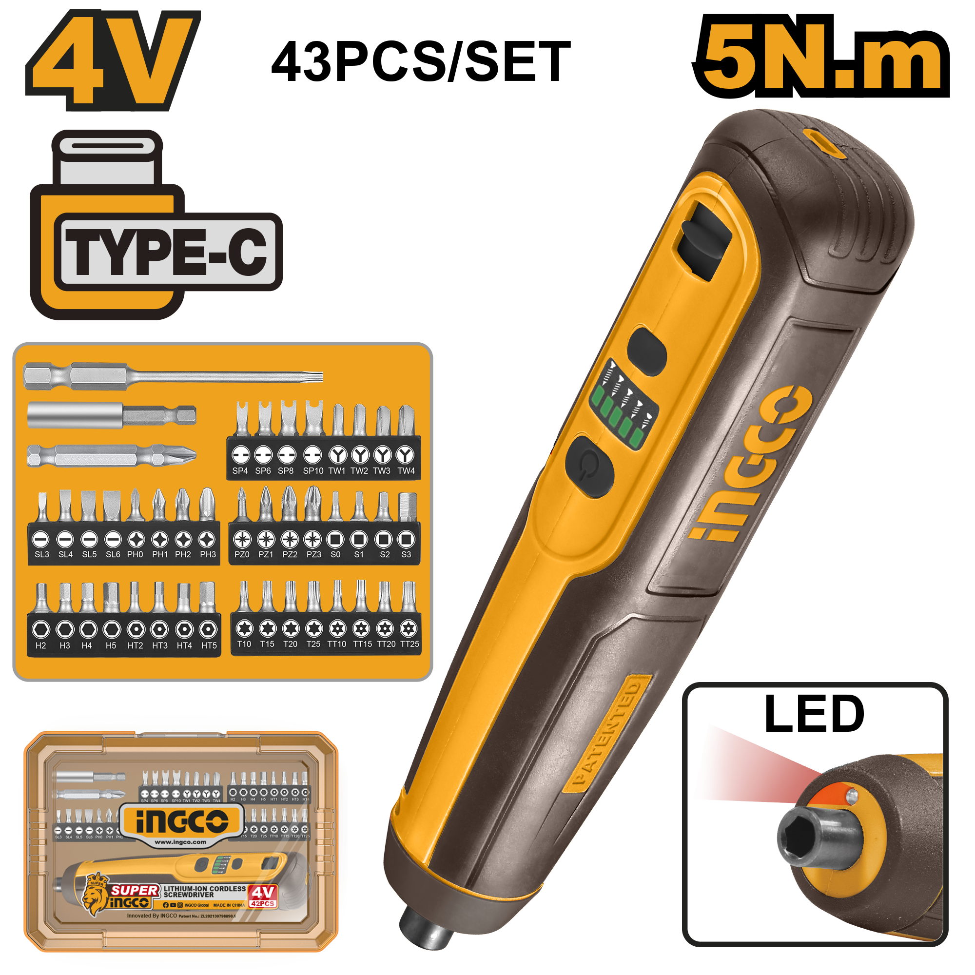 El destornillador inalámbrico viene con un completo set de accesorios para adaptarse a todo tipo de aplicaciones. El paquete incluye: 40 piezas de puntas Cr-V de 25mm, un portapuntas, una pieza de punta Cr-V de 50mm, una pieza de punta Cr-V de 74mm, y una pieza de conector. Estas herramientas están fabricadas con materiales resistentes y de alta calidad para una larga vida útil incluso en condiciones exigentes.