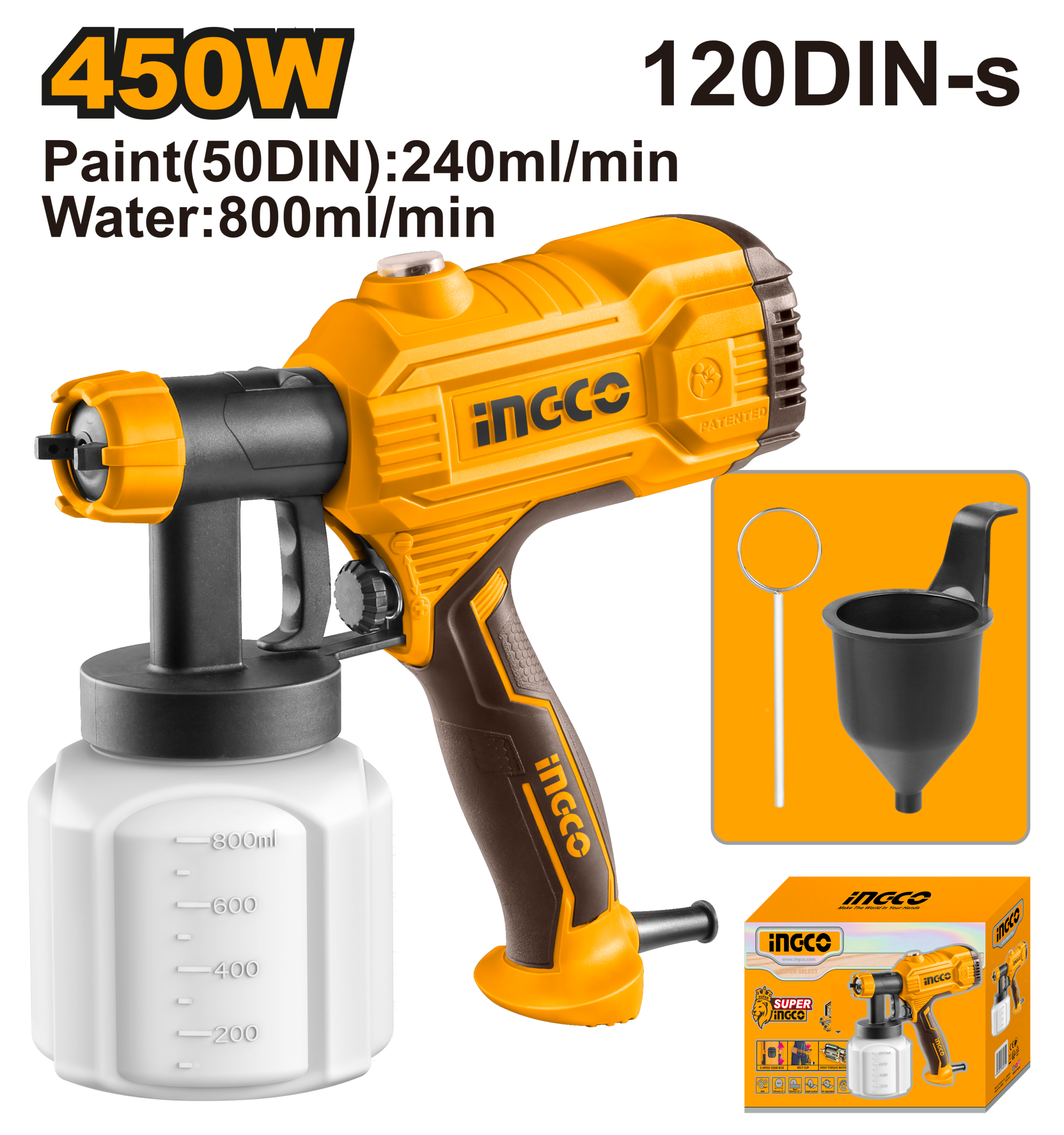 Este dispositivo cuenta con un potente motor eléctrico de 450W, funcionando con un voltaje de 110-120V~50/60Hz, lo que asegura un desempeño confiable en diferentes escenarios. La presión de pulverización oscila entre 0.1 y 0.2 Bar, ofreciendo la precisión necesaria para cubrir superficies con detalles específicos. Con un flujo máximo de 550 ml/min, la pistola permite realizar tareas grandes en menos tiempo, mientras que soporta una viscosidad máxima de 120 DIN-s, adaptándose perfectamente a diferentes tipos de pinturas para resultados óptimos.